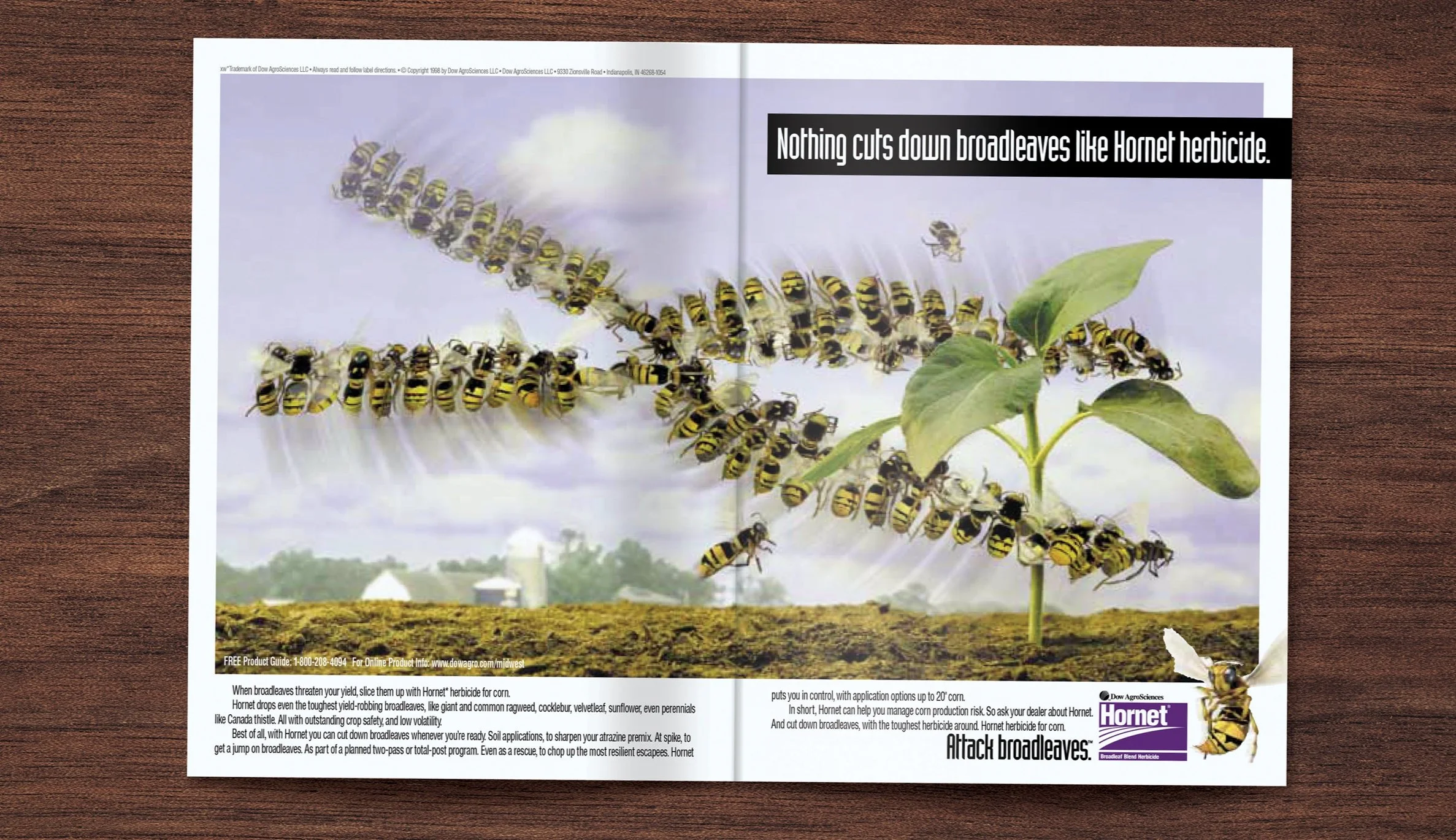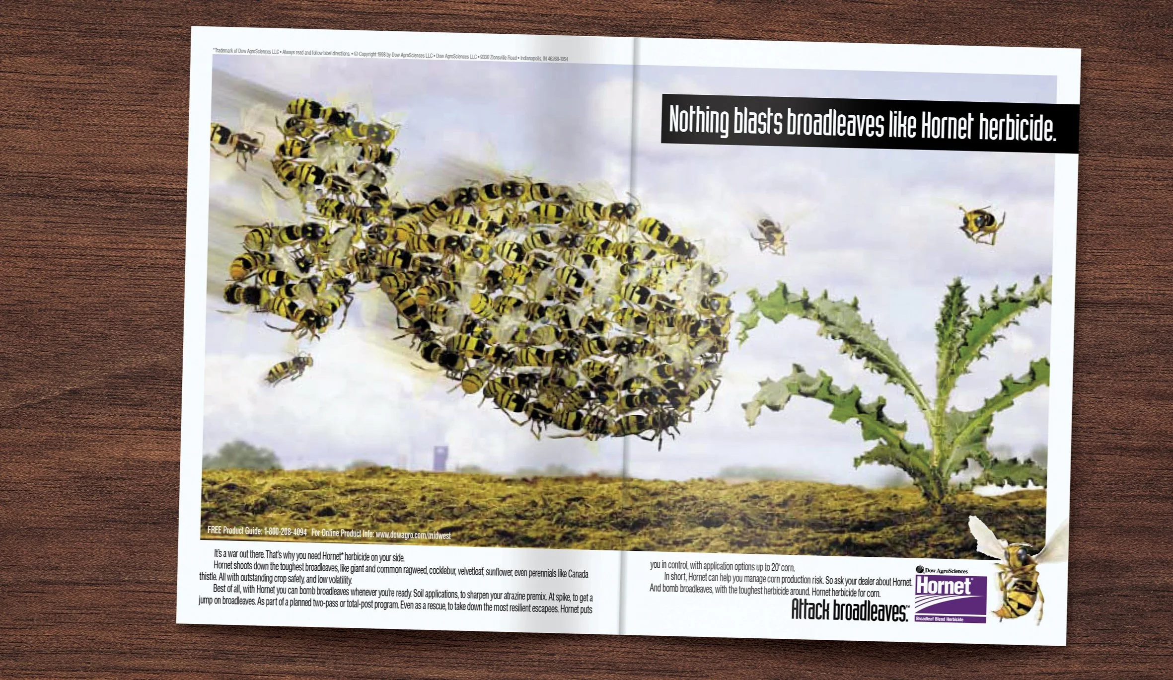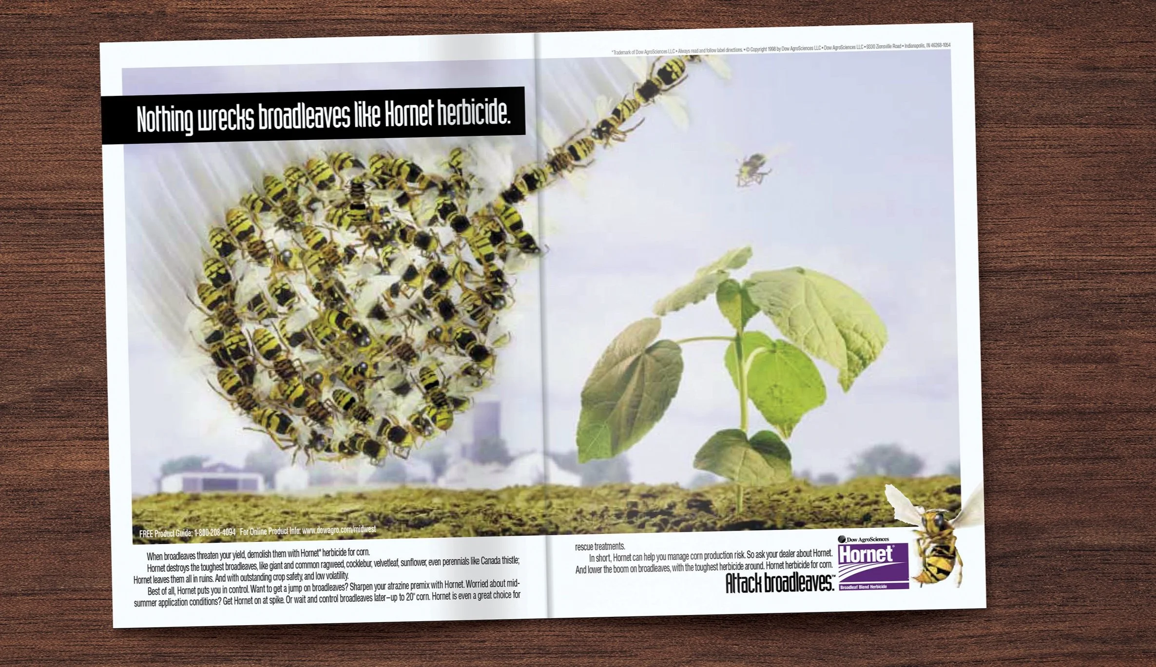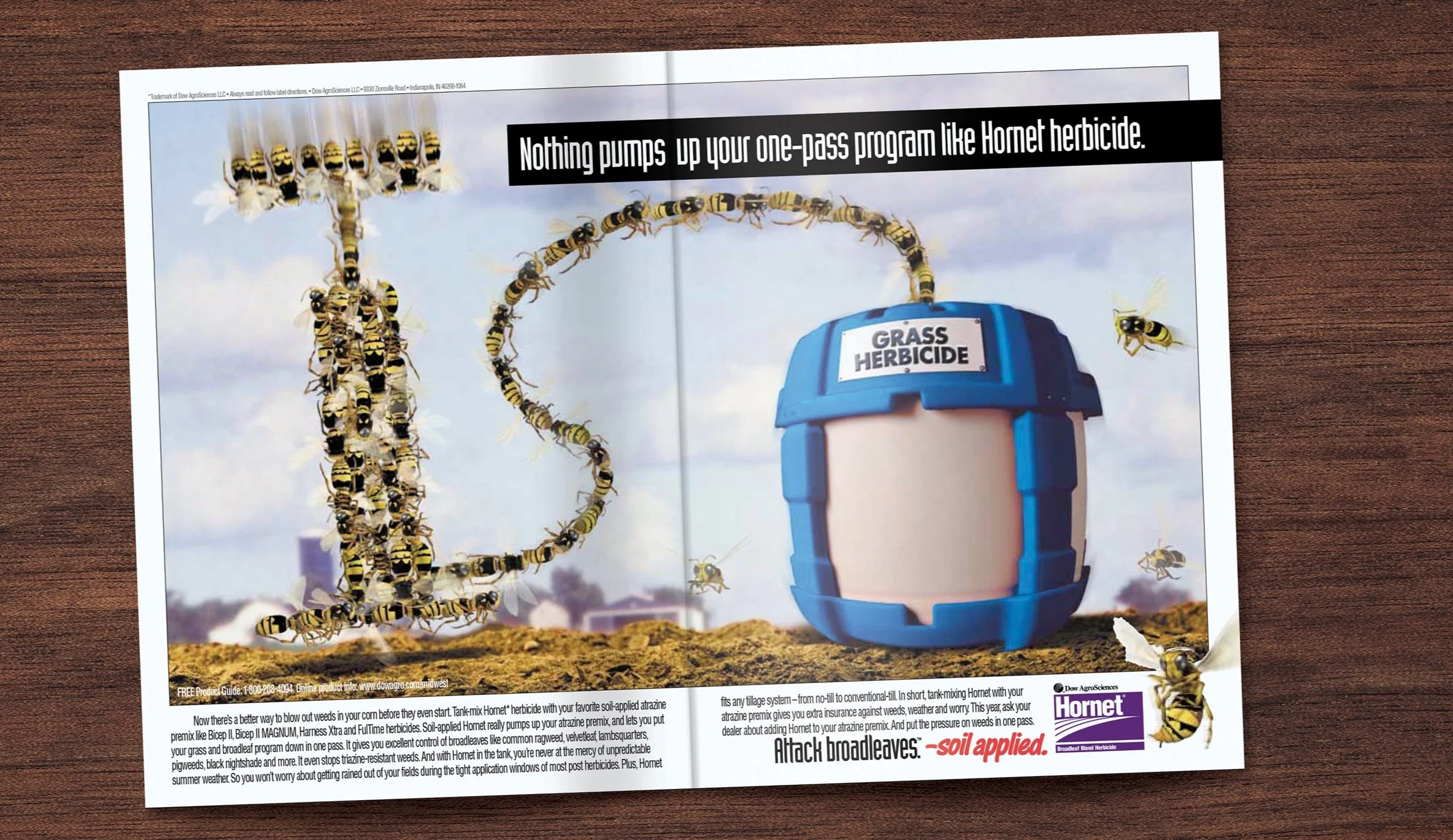 Hornet HerbicideI love working on agriculture accounts. This campaign won the National Agri-Marketing Association’s best campaign as well as several regional Addy Awards. A fun, relevant way to promote a commodity product Bomb Ad Wrecking Ball Ad Scissors Ad Pump Ad Cage Ad 20” Ruler Direct Mail Peanut Brittle Direct Mail WD40 Direct Mail Goop Direct Mail “Attack Broadleaves” “Raccoon” “Crow”